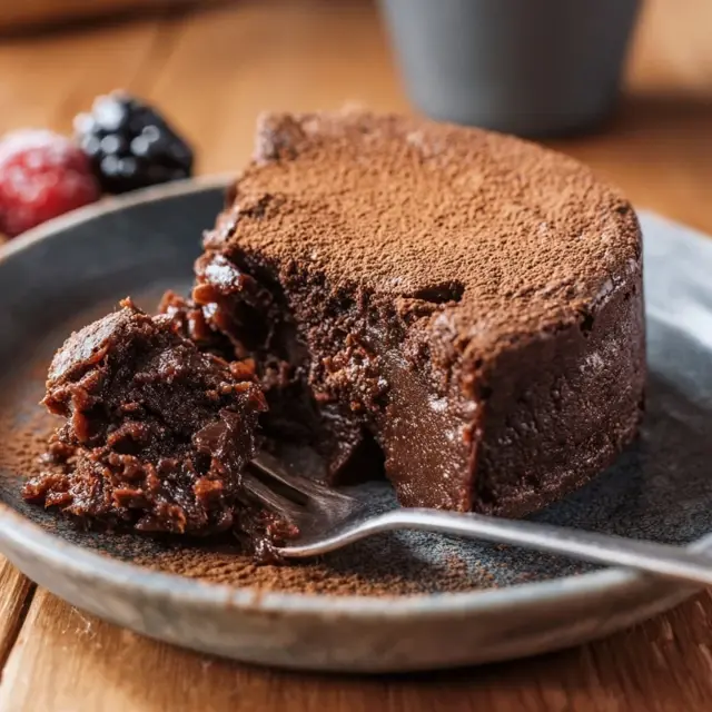 Sers ce gâteau tiède, avec une cuillère de yaourt nature ou une compote maison à côté. Un peu de cacao tamisé sur le dessus, quelques fruits rouges pour la couleur… et voilà.